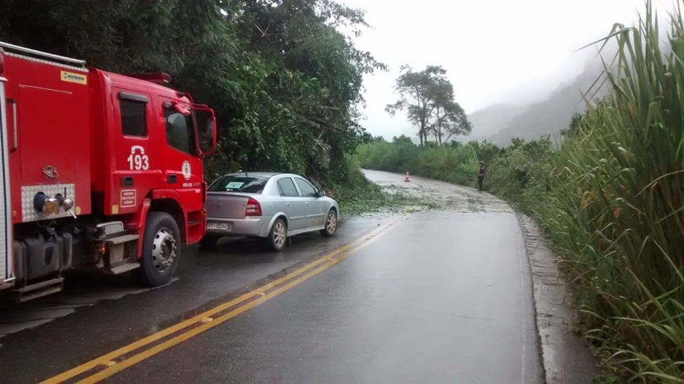 mostram a queda de uma árvore obstruindo parcialmente a passagem na RJ 148.