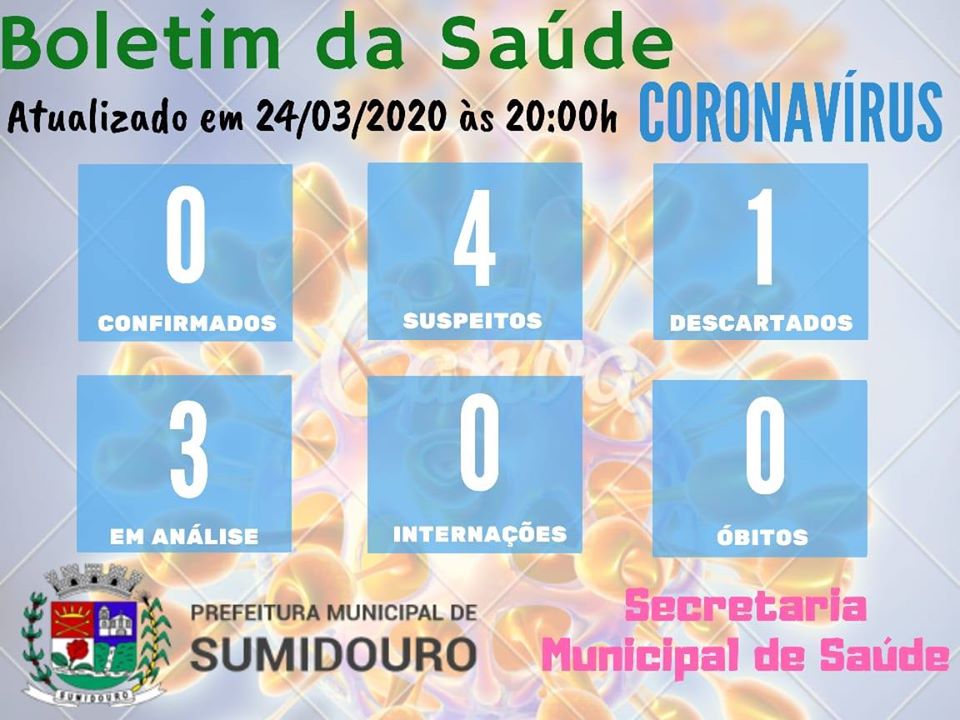 Dos quatro casos suspeitos anunciados no final de semana uma suspeita foi descartada e seguem três casos continuam em isolamento e em investigação. Apesar desse descarte é importante que a população continue colaborando e seguindo as determinações do poder público municipal ficando o maior tempo possível em suas residências. Lembrando que por força de Decreto Municipal nº 3.377/2020 a grande maioria dos estabelecimentos comerciais estão proibidos de funcionarem em todo o município de Sumidouro.