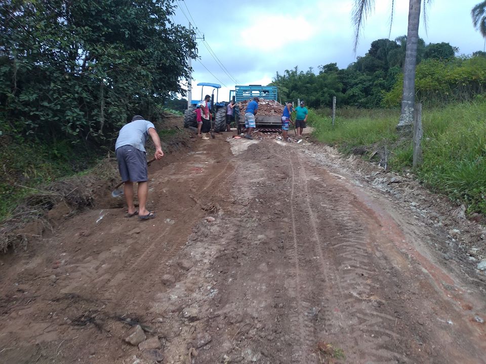 mutirão com caminhões de entulho, máquina agrícola e muita disposição para